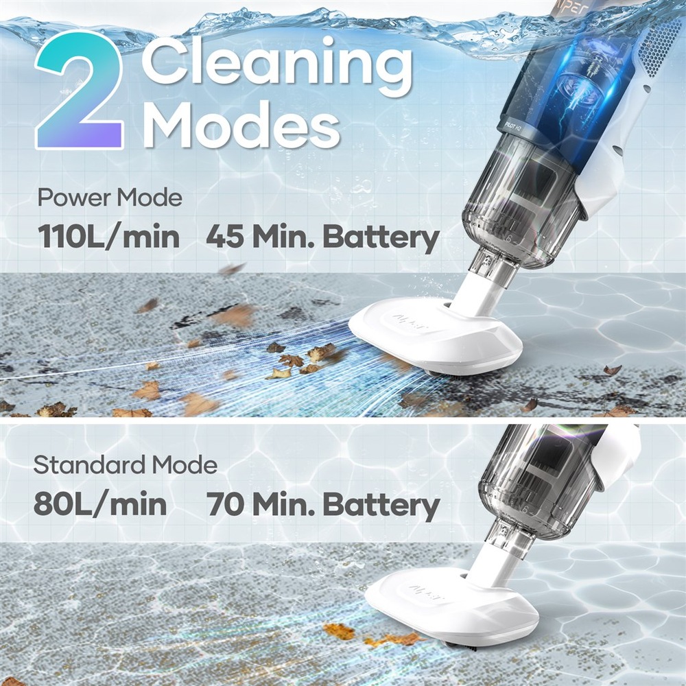 Hledáte spolehlivého pomocníka pro údržbu vašeho bazénu či vířivky? Ruční robotický vysavač bazénů Aiper Pilot H2 Vacuum zaručí dokonalou čistotu ve všech typech bazénů do 50 m2. Tento špičkový přístroj se snadno ovládá jediným tlačítkem, což z něj činí ideálního společníka pro každodenní údržbu. Pilot H2 je vybaven dvěma režimy sání, které umožňují přizpůsobit výkon čištění aktuálním potřebám. Díky kompaktním rozměrům a nízké hmotnosti je manipulace s vysavačem snadná a pohodlná. Přístroj je navíc schopný účinně vyčistit nejen dno bazénu, ale také jeho stěny a schody, čímž zajišťuje komplexní údržbu všech zákoutí. Rukojeť má průměr 2,8 cm a pasuje do ní jakákoliv tyč od bazénového příslušenství.