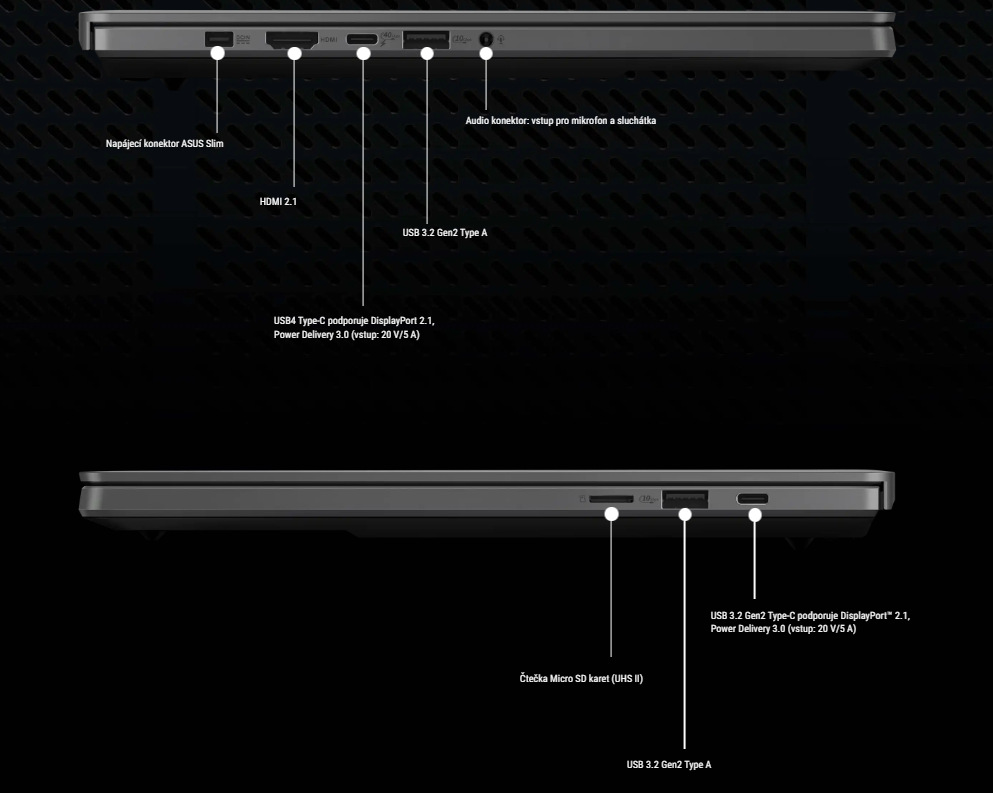 I přes štíhlé tělo vás notebook příjemně překvapí konektivitou. Kromě dvou USB-C s podporou připojení monitoru i napájení totiž nabízí i praktické porty USB 3.2 či čtečku paměťových karet, kterou ocení například fotografové.