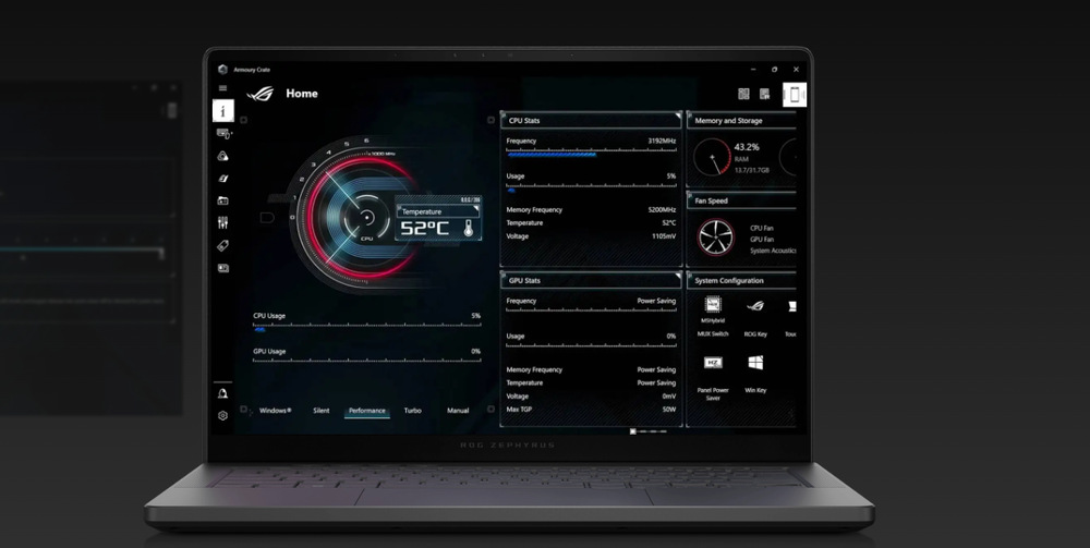 Software ROG Armoury Crate na jednom místě přináší vše důležité pro ovládání systému a podsvícení Aura Sync. Můžete v něm nastavovat i speciální scénáře, které se automaticky aktivují u spouštění vybrané hry atp., stejně jako v reálném čase sledovat výkon.