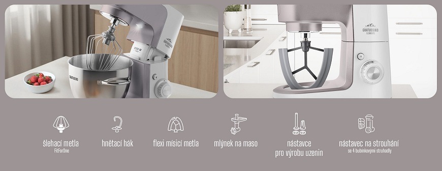 Kuchyňský robot ETA Gratussino III Elements je vybaven bohatým příslušenstvím, které vám usnadní každodenní vaření i pečení. S hnětacím hákem zvládnete přípravu hutných těst, zatímco flexi mísicí metla je ideální pro lehké krémy a jemná těsta. Šlehací metla FitForOne s nastavitelnou výškou zaručí perfektně vyšlehaný sníh z bílků nebo šlehačku.