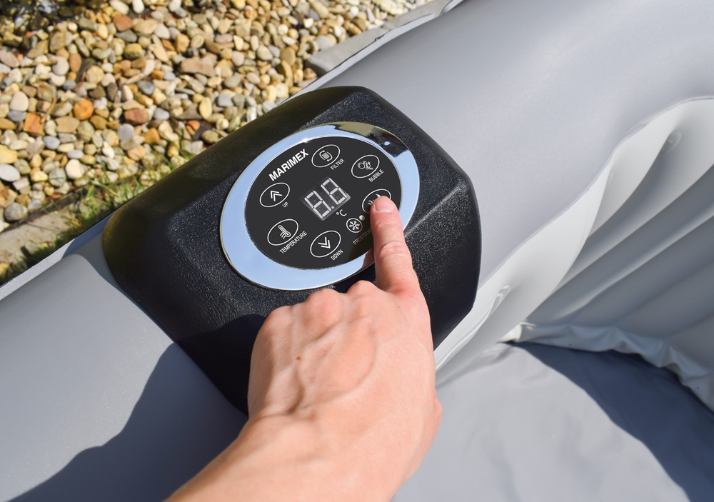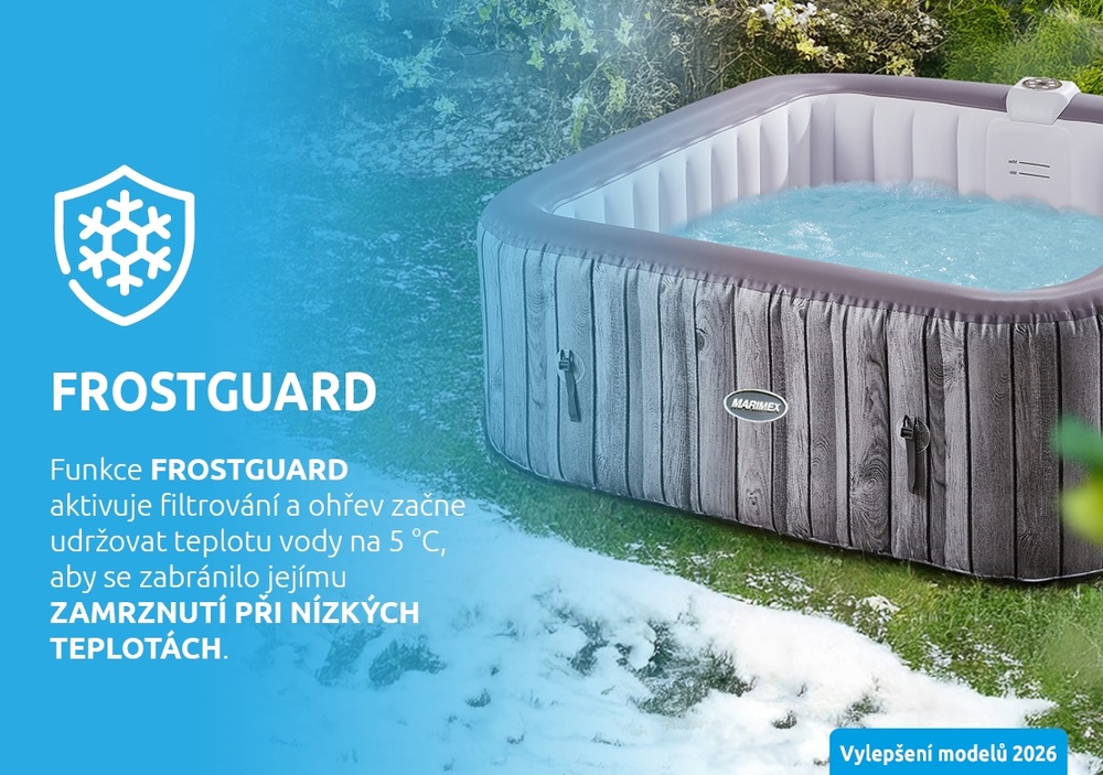 nafukovací vířivý bazén • pro 6 osob • objem vody 910 l • 130 vzduchových trysek • funkce Frostguard brání zamrznutí • čerpadlo a filtrační systém zabudované do stěny vířivky • kartušový filtr •
