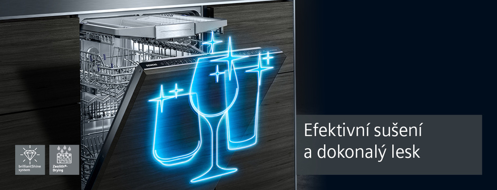 Unikátní teologie Zeolith® usuší vaše nádobí rychle i efektivně. Poradí si i s plastovým nádobím. Zeolith je přírodní minerál, který má schopnost absorbovat vlhkost a přeměnit ji na horký vzduch. Teplo usuší nádobí rychle a velmi efektivně. Systém BrilliantShine zaručí zářivé a suché skleněné nádobí.
