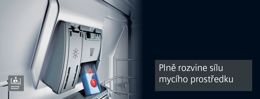 Dávkovací asistent zaručí, že mycí tableta vypadne přímo do malé záchytné misky. Ta je umístěna vpředu na vrchním koši na nádobí. Proudem vody se tableta rozpustí kontrolovaně, rychle a beze zbytků. Mycí prostředek se tak rozptýlí po celém vnitřku myčky a tím dosáhnete perfektního umytí.